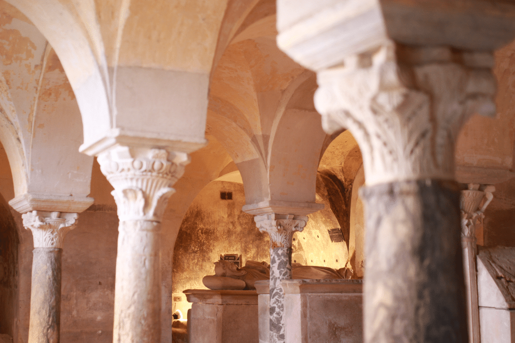 À l’extérieur de la crypte, on peut observer les vestiges de la basilique funéraire, détruite lors de la Guerre de Cent Ans. L’accumulation des strates de sol au fil des siècles explique pourquoi il faut descendre une douzaine de marches pour accéder aux cryptes.